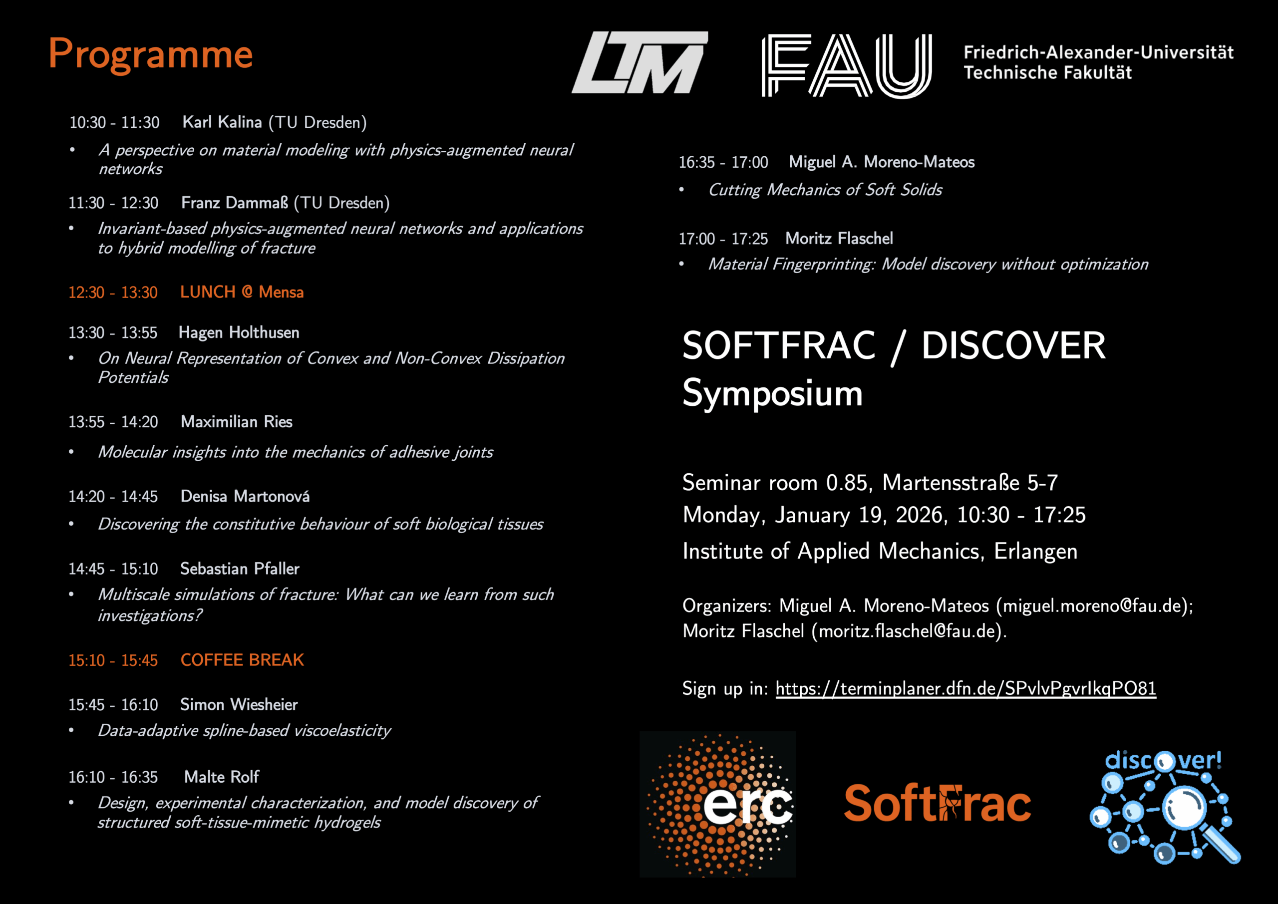 On the occasion of the visit of Karl Kalina and Franz Dammaß from TU Dresden, we are organizing a Symposium for scientific exchange. The talks are aligned with the research topics of SOFTFRAC and DISCOVER ERC projects.